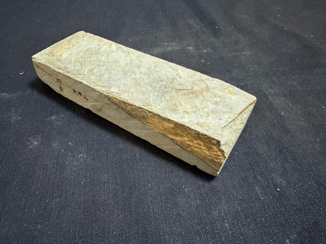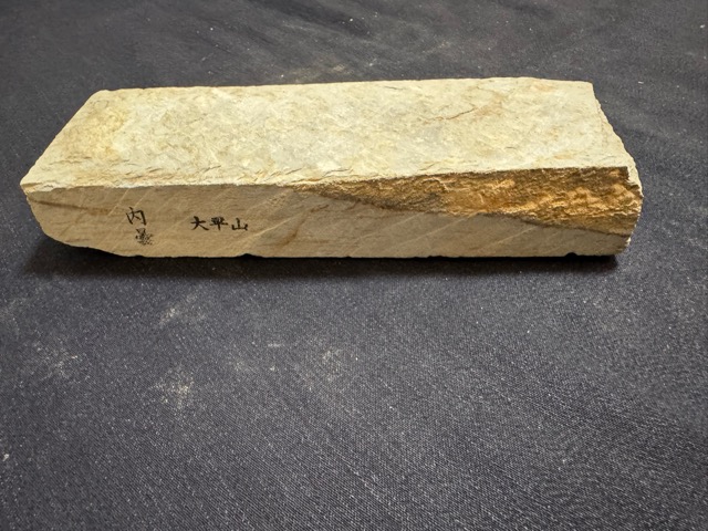 大平は愛宕山付近にあり、最近まで採掘が行われていた数少ない鉱山。今回ご紹介する商品は大平の内曇です。内曇は刀剣研ぎに欠かせない天然仕上砥石です。今回ご紹介する石は程良く硬い石で筋もない上質の砥石です。刃艶としてだけでなく面をつけて研ぐことも出来ます。