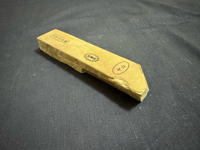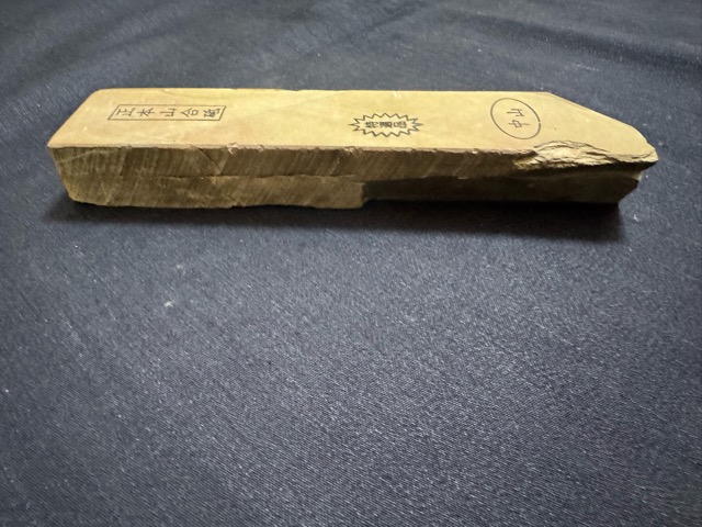天然砥石の最高峰と言われる京都仕上げ砥石の中でも別格の品質で、鎌倉時代から採掘され、歴代の天皇、幕府の御用砥石とされてきたのが、梅ヶ畑の中心部の中山(加藤鉱山)で採掘された中山の砥石(通称マルカ)です。天然砥石の中でもダントツの人気です。今回、長さのあるサン型の中山砥石をご紹介します。細かな研ぎに中山が欲しいと言うお客様に最適です。違いは明らかですので、是非この機会にお買い求めください。