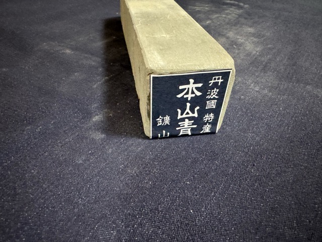 青砥は主に京都西側の丹波地方亀岡で取れる中砥石です。家庭用の包丁などはこれだけで仕上げとしても使えます。通常は荒砥石、中砥石で荒研ぎ、中研ぎの後に合砥石をかけて仕上げますが、合砥石の前に青砥をかけてから仕上げた方がよく乗ります。今回ご紹介する青砥は昔の採掘元のラベルがついたサン型の砥石です。