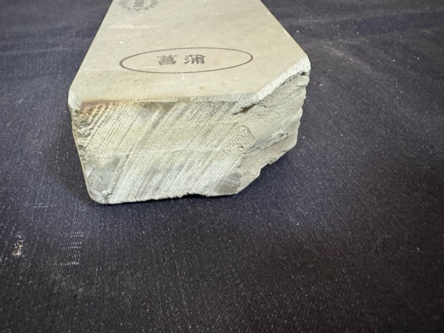 菖蒲は京都天然砥石の中でも最も歴史が古く、すぐ近くに大突、奥殿、中山といった横綱級の砥石が産出されていた梅ヶ畑を代表する鉱山の一つです。品質も中山、奥殿、大突と肩を並べる砥石がとれた山さでしたが既に閉山しています。ノミ、カンナ、包丁など幅広くお使い頂けます。今回ご紹介する石は地味な色ですが硬口で長さがあり使いやすい大きさの砥石です。菖蒲らしい丁度良い硬さで細かい刃がつく逸品です。