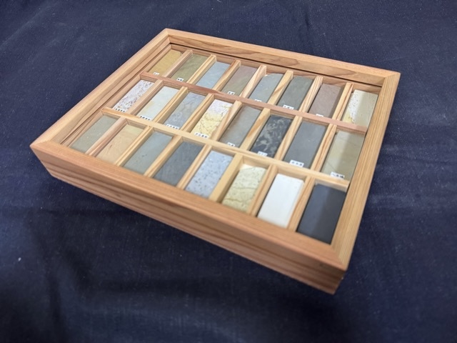 今では希少な天然砥石を24種類の見本を集めた標本額です。家具職人による一つ一つ手作りの天然木の額が天然砥石を際立たせる逸品でインテリアとしても映えます。今回数量限定入荷で次回入荷未定です。この機会にお見逃しなく。