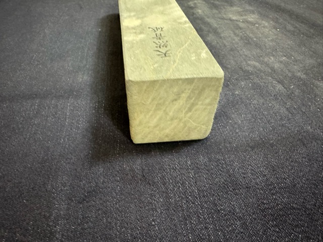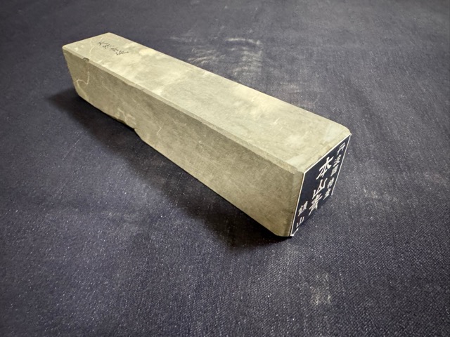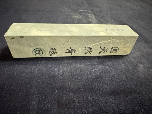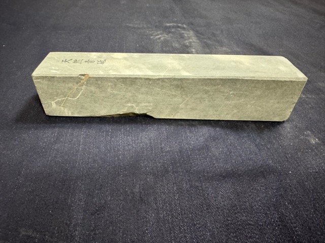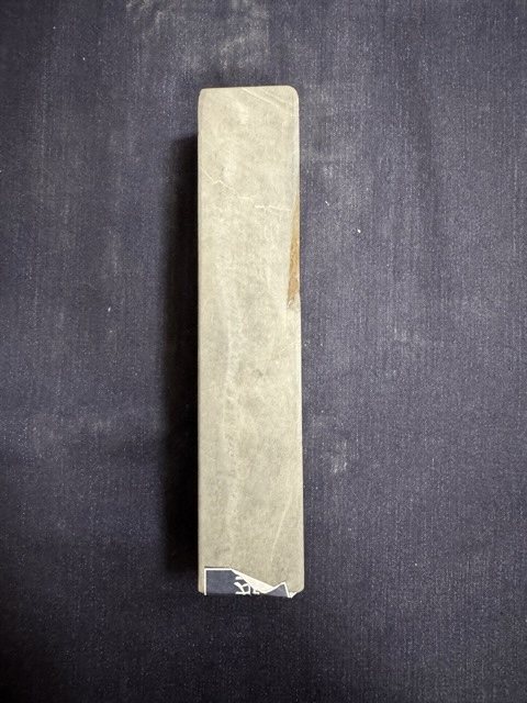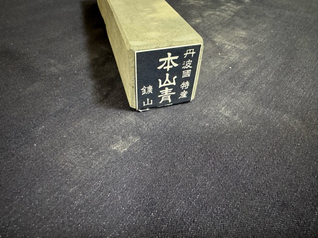 青砥は主に京都西側の丹波地方亀岡で取れる中砥石です。家庭用の包丁などはこれだけで仕上げとしても使えます。通常は荒砥石、中砥石で荒研ぎ、中研ぎの後に合砥石をかけて仕上げますが、合砥石の前に青砥をかけてから仕上げた方がよく乗ります。今回ご紹介する青砥は昔の採掘元のラベルがついたサン型の砥石です。