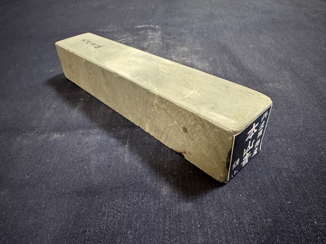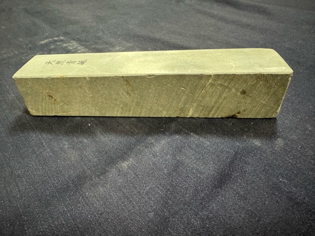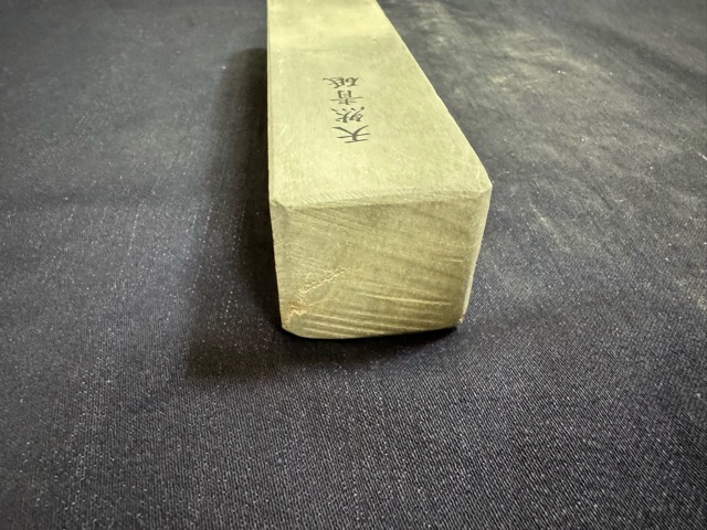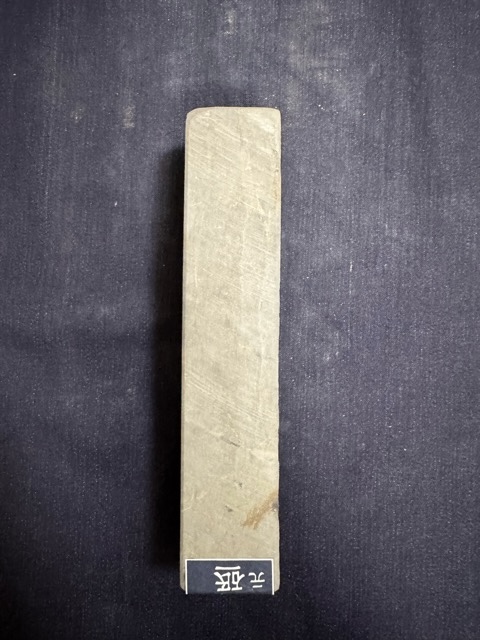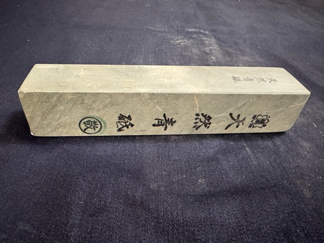 青砥は主に京都西側の丹波地方亀岡で取れる中砥石です。家庭用の包丁などはこれだけで仕上げとしても使えます。通常は荒砥石、中砥石で荒研ぎ、中研ぎの後に合砥石をかけて仕上げますが、合砥石の前に青砥をかけてから仕上げた方がよく乗ります。今回ご紹介する青砥は昔の採掘元のラベルがついたサン型の砥石です。